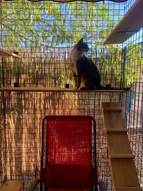 I decided on two catios – a metal-framed chicken coop and a pre-designed kit of two units connected by a bridge and a tunnel. I was very fortunate to have a skilled and kind neighbor help with the assembly and now I’m having fun decorating them! If you’re like me, you will love watching your cats enjoy their stimulating sanctuary! The peace of mind and lack of dead bird offerings are nice touch!